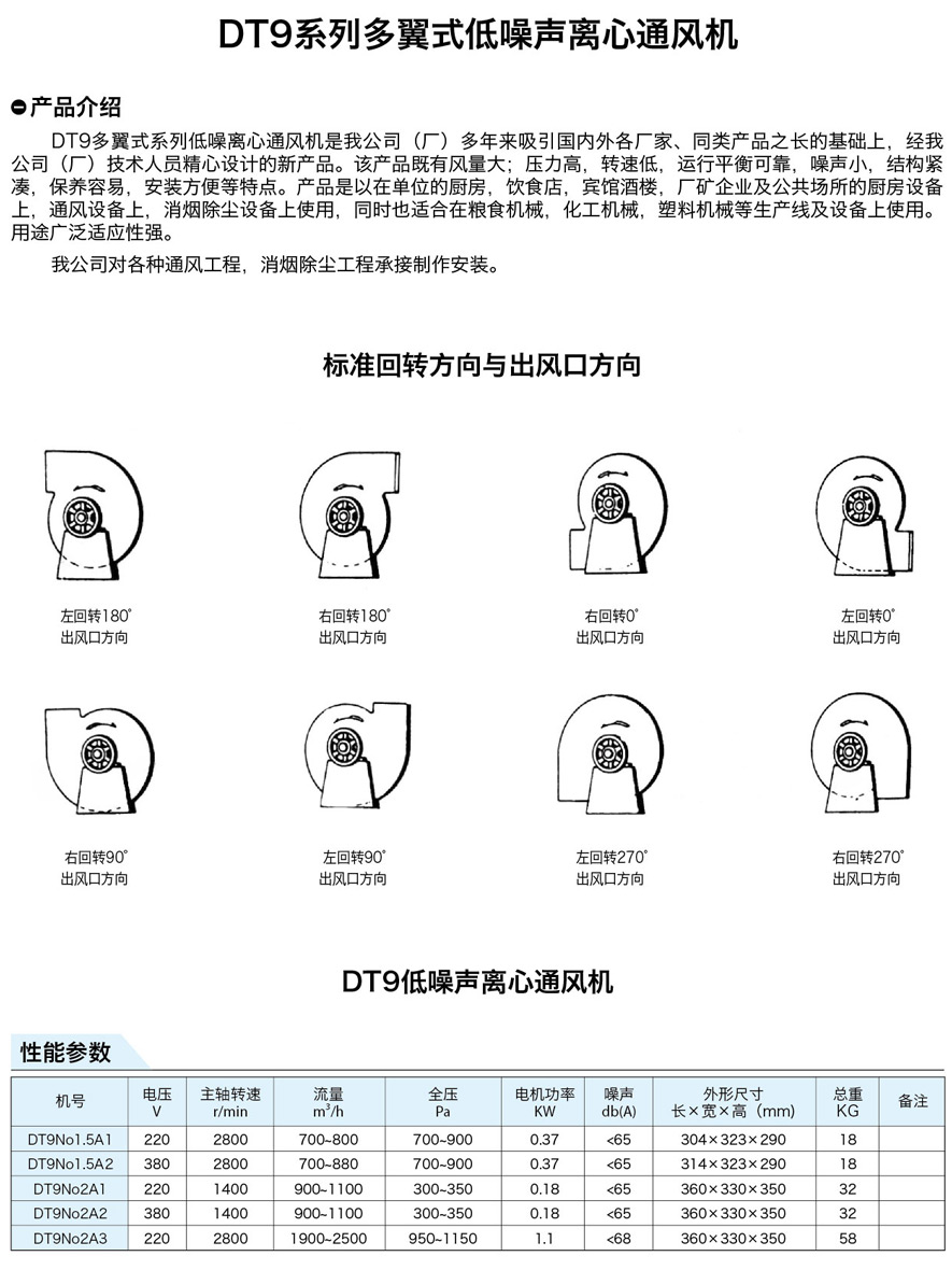 DT9多翼式系列低噪離心通風(fēng)機(jī)是我公司(廠)多年來吸引國內(nèi)外各廠家、同類產(chǎn)品之長的基礎(chǔ)上,經(jīng)我 公司(廠)技術(shù)人員精心設(shè)計(jì)的新產(chǎn)品。